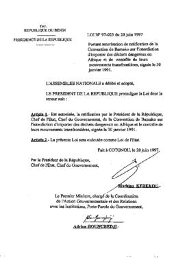 portant autorisation de ratification de la Convention de Bamako sur l'interdiction d'importer des déchets dangereux en Afrique et de contrôle de leurs...