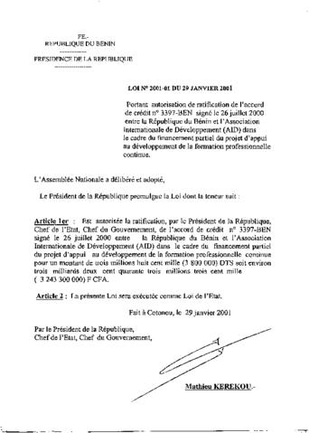 portant autorisation de ratification de l'accord de crédit signé le 17 janvier 2002 entre la République du Bénin et l'Association Internationale de Dé...
