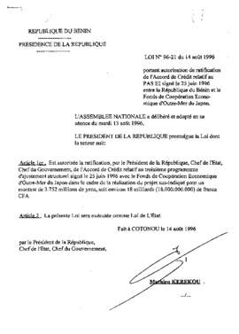 portant autorisation de ratification de l’accord de crédit relatif au PAS III signé le 25 Juin 1996 entre la République du Bénin et le Fonds de Coopér...