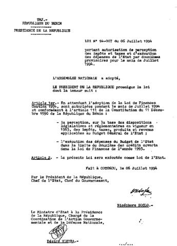 portant autorisation de perception des Impôts et taxes et d'exécution des dépenses de l'Etat par douzièmes provisoires pour le mois de juillet 1994