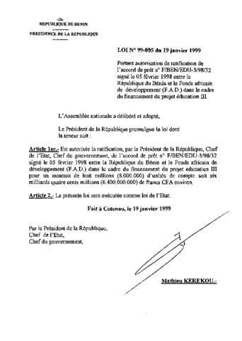 portant autorisation de ratification de l'accord de prêt n° F/BEN/EDU-3/98/32 signé le 05 février 1998 entre la République du Bénin et le fonds Africa...