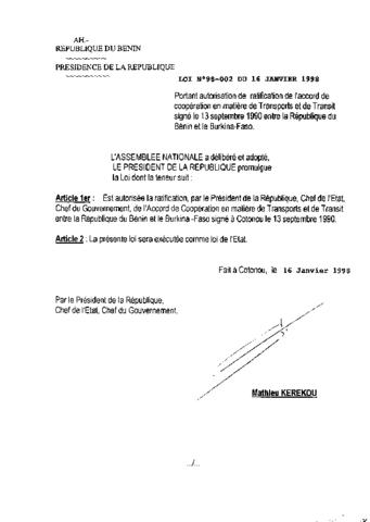 portant autorisation de ratification de l'accord de coopération en matière de transports et de transit signé le 13 septembre 1990 entre la République...