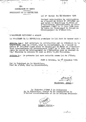 portant autorisation de ratification de l'Accord de Crédit N° 2613/BEN signé entre la République du Bénin et l'Association Internationale de Dévelop...
