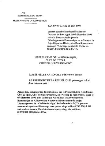 portant autorisant la ratification de l'Accord de prêt PC-BN 92 03 00 signé le 08 décembre 1995 entre la République du Bénin et la Banque Ouest Africa...