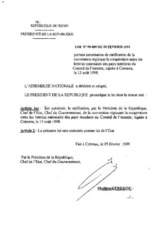 portant autorisation de ratification de la convention régissant la coopération entre les loteries nationales des pays membres du Conseil de l'Entente,...