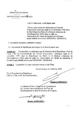 portant autorisation de ratification de l'accord de prêt signé le 27 Décembre 1999 entre la République du Bénin et la Banque Ouest Africain de Dévelop...