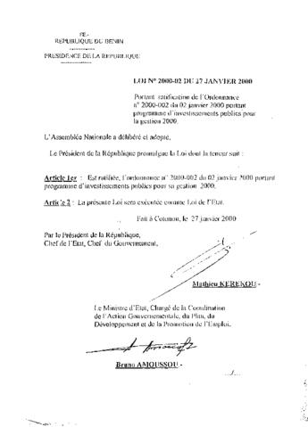 portant ratification de l'ordonnance n°2000-002 du 02 janvier 2000 portant programme d'investissements publics pour la gestion 2000