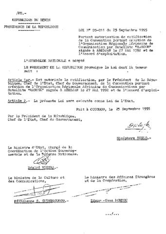 portant autorisation de ratification de la Convention portant création de l'Organisation Régionale Africaine de Communication par Satellite “RASCOM“