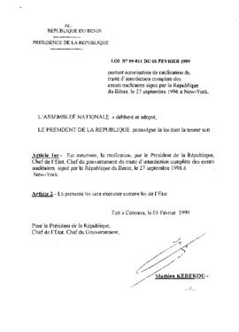 portant autorisation de ratification du traité d’interdiction complète des essais nucléaires signés par la République du Bénin, le 27 septembre 1996 à...