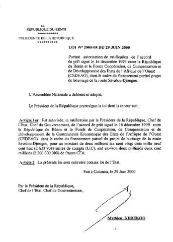 portant autorisation de ratification de l’accord de prêt signé le 16 décembre 1999 entre la République du Bénin et le Fonds de coopération, de compens...