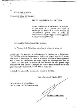 autorisation de ratification de l'accord de prêt signé le 13 janvier 2000 entre la République du Bénin et le Fonds Africain de Développement (FAD) d...