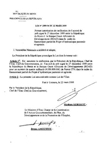portant autorisation de ratification de raccord de prêt signé le 27 décembre 1999 entre la République du Bénin et la Banque Ouest Africaine de Dévelop...