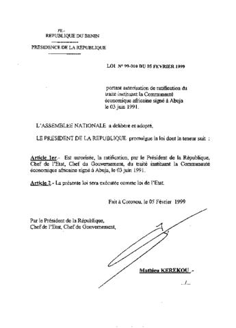 portant autorisation de ratification du traité instituant la communauté économique africaine signé à Abuja le 03 juin 1991