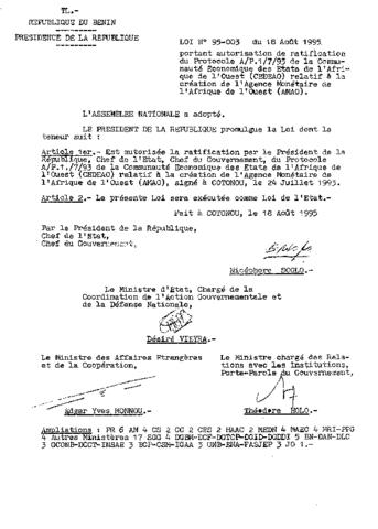 LOI N°95-003 DU 18 AOÛT 1995