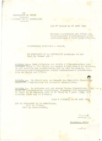 portant restitution par l'État des Établissements d'Enseignement privé Confessionnels à leurs propriétaires.
