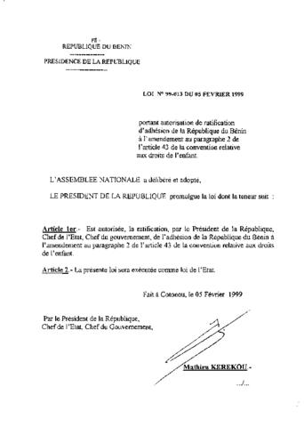 portant autorisation d’adhésion de la République du Bénin à l’ au paragraphe 2 de l’article 43 de la Convention relative aux droits de l’enfant