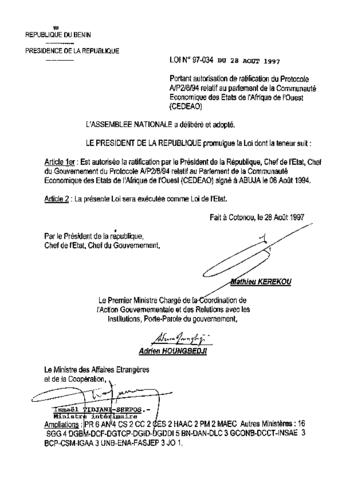 portant autorisation de ratification du protocole A/ P2/ 8/ 94 relatif au Parlement de la Communauté Economique des Etats de l’Afrique de l’Ouest (CED...