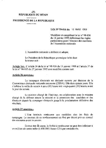 modifiant et complétant la loi N° 98-034 du 15 janvier 1999 portant règles générales pour les élections en République du Bénin