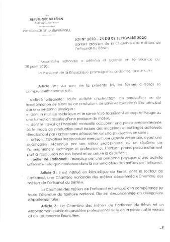portant création de la chambre des métiers de l'artisanat au Bénin