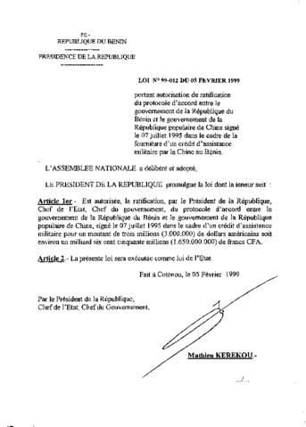 portant autorisation de ratification du protocole d'accord entre le gouvernement de la République du Bénin et le gouvernement de la République populai...