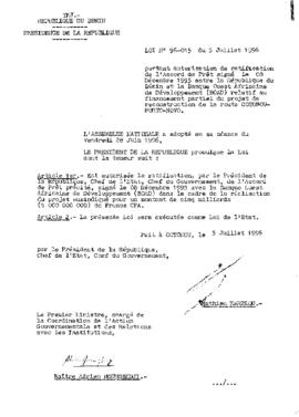portant autorisation de ratification de l’accord de prêt signé le 08-12-1995 entre la République du Bénin et la Banque Ouest Africaine de Développemen...