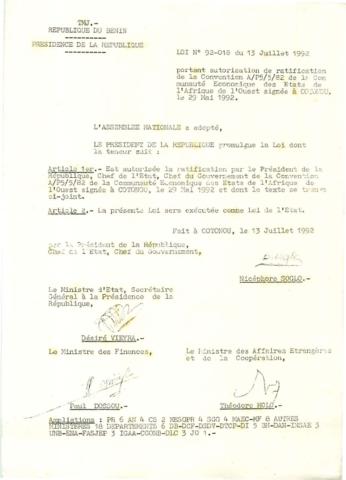 portant autorisation de ratification de la Convention A/P5/5/82 de la Communauté Economique des Etats de l'Afrique de l'Ouest signée à COTONOU le 29 M...