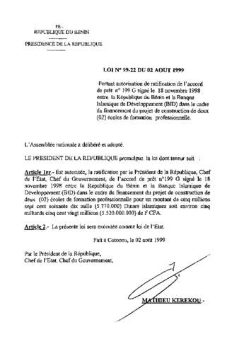 Portant autorisation de ratification de l'accord de prêt n O 199 G signé le 18 novembre 1998 entre la République du Bénin et la Banque Islamique de Dé...
