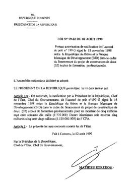 Portant autorisation de ratification de l'accord de prêt n°199 G signé le 18 novembre 1998 entre la République du Bénin et la Banque Islamique de Déve...