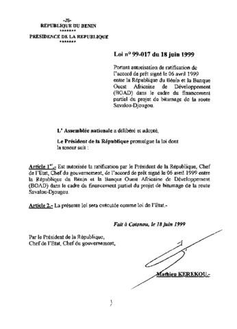 portant autorisation de ratification de l'accord de prêt signé le 06 avril 1999 entre la République du Bénin et la Banque ouest Africaine de développe...