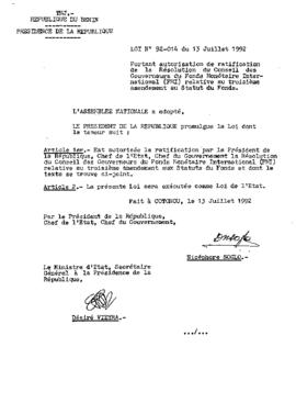 portant autorisation de ratification de la Résolution du Conseil des Gouverneurs du Fonds Monétaire International (FMI) relative au troisième amendeme...