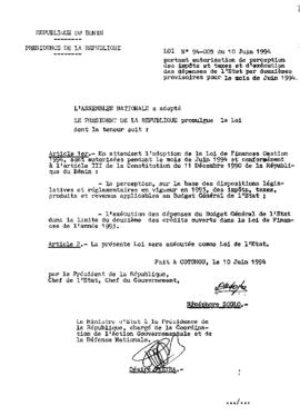 autorisant la perception des impôts, taxes et l'exécution des dépenses de l'État par douzièmes provisoires pour le mois de juin 1994