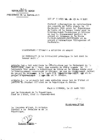 portant autorisation de ratification des accords de prêt signé le 11 septembre 1990 entre la République du Bénin et la banque Arabe pour le développem...