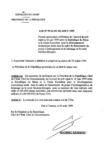 portant autorisation de ratification de l'accord de prêt signé le 16 Juin 1999 entre la République du Bénin et le Fonds Koweitiens pour le développem...