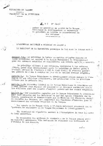créant un privilège au profit de la Banque Dahoméenne de Développement et organisant la procédure en matière de recouvrement de ses créances