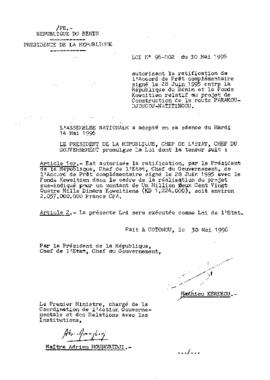 autorisant la ratification de l'Accord de Prêt complémentaire signé le 28 Juin 1995 entre la République du Bénin et le Fonds Koweitien relatif au proj...