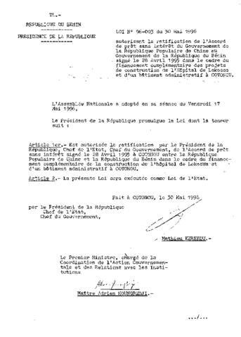 Loi autorisant la ratification de l'Accord de prêt sans intérêt du Gouvernement de la République Populaire de Chine au Gouvernement de la République d...