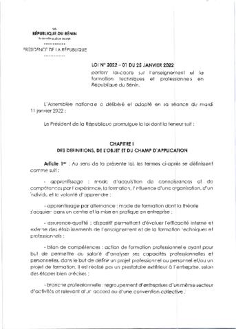 portant loi-cadre sur l'enseignement et la formation techniques et professionnels en République du Bénin.