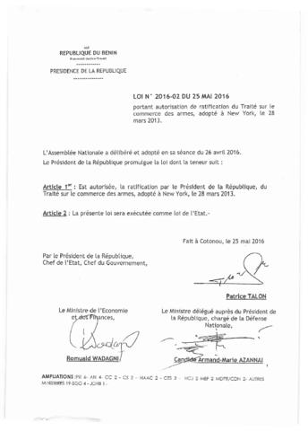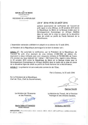 Portant autorisation de ratification de l'accord de prêt signé à Lima (Pérou), le 09 octobre 2015 entre la République du Bénin et la banque Arabe pour...