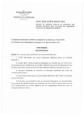 portant loi uniforme relative au traitement des comptes dormants dans les livres des organismes financiers en République du Bénin