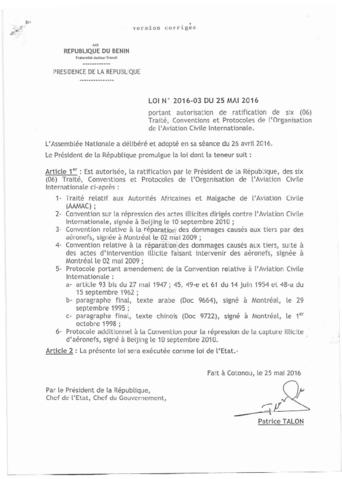 portant autorisation de ratification de six (06) traité, convention et protocoles de l'organisation de l'aviation civile internationale