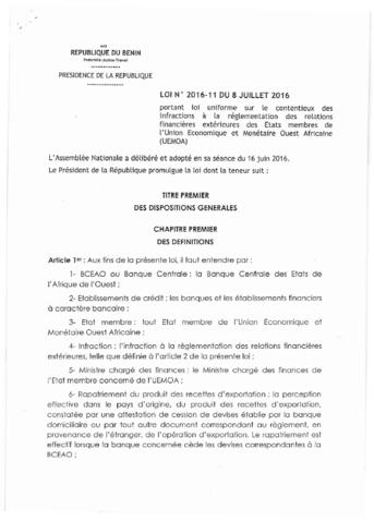 portant loi uniforme sur le contentieux des infractions à la règlementations des relations financières extérieures des Etats membres de l'Union Econo...