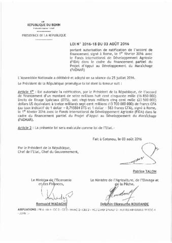 portant autorisation de ratification de l'accord de financement signé à Rome, le 1er Février 2016 avec le Fonds International de Développement Agricol...