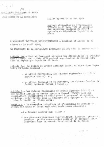 portant abrogation de l'Ordonnance de N°76-30 du 11 Juin 1976 et adoption des principes généraux du Crédit Agricole en République du Bénin