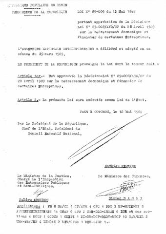 portant approbation de la Décision-Loi N°89-008/ANR/CP du 20 avril 1989 sur le redressement économique et financier de certaines Entreprises