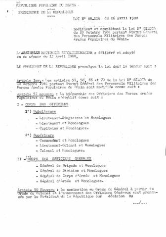 modifiant et complétant la loi N°81-014 du 10 Octobre 1981 portant Statut Général des Personnes Militaires des Forces Armées Populaires du Bénin