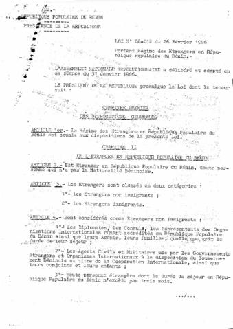 Portant Régime des Étrangers en République Populaire du Bénin.