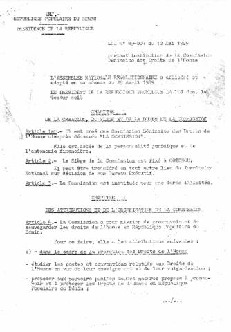 portant institution de la commission Béninoise des Droits de l'Homme.