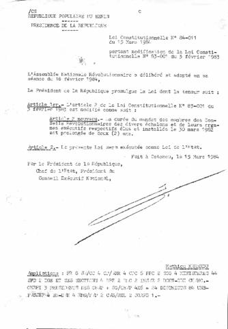 LOI Constitutionnelle N°84-011 du 15 Mars 1984