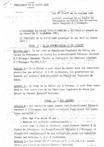 portant création de la caisse de prévoyance au profit des ressortissants béninois à l'étranger